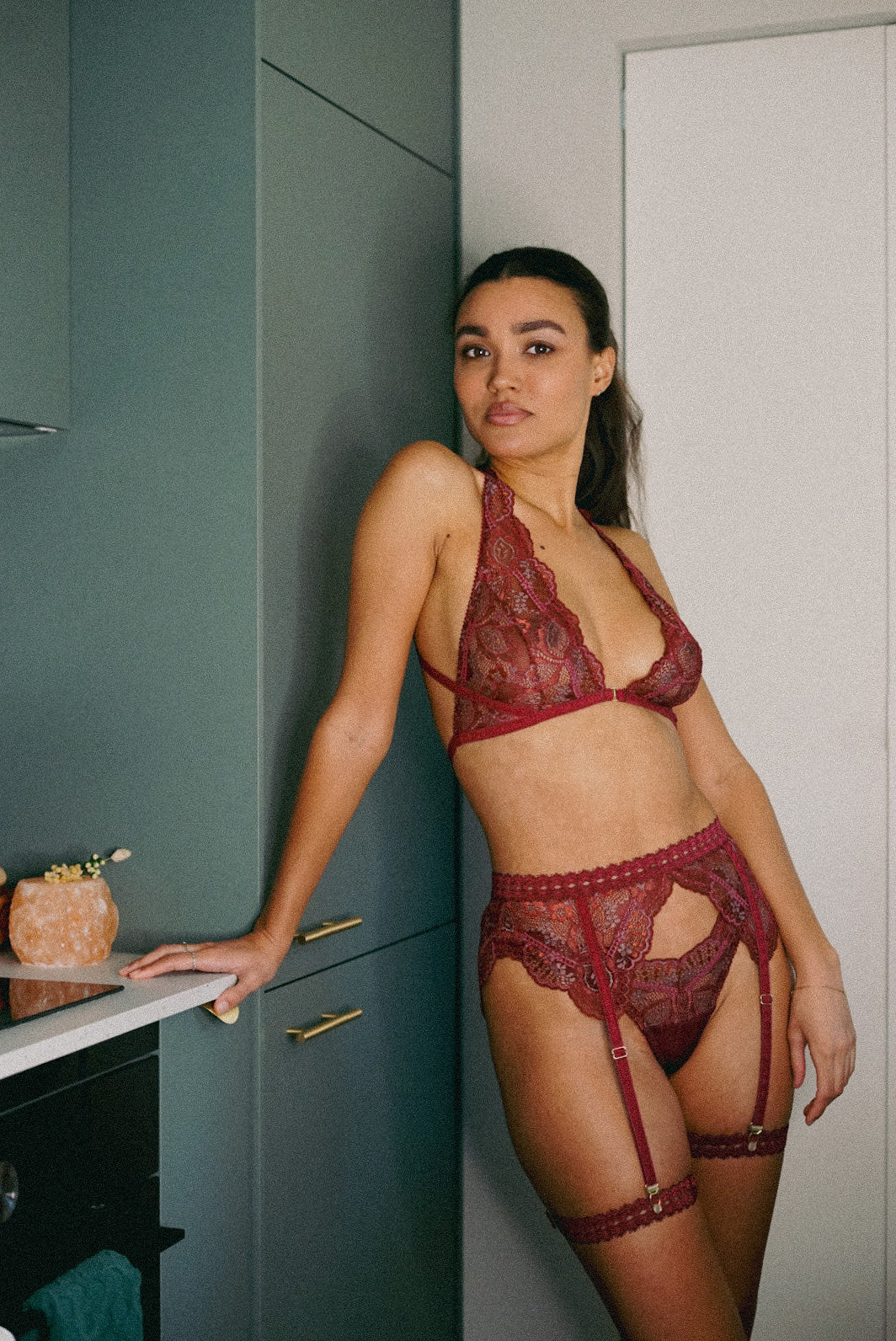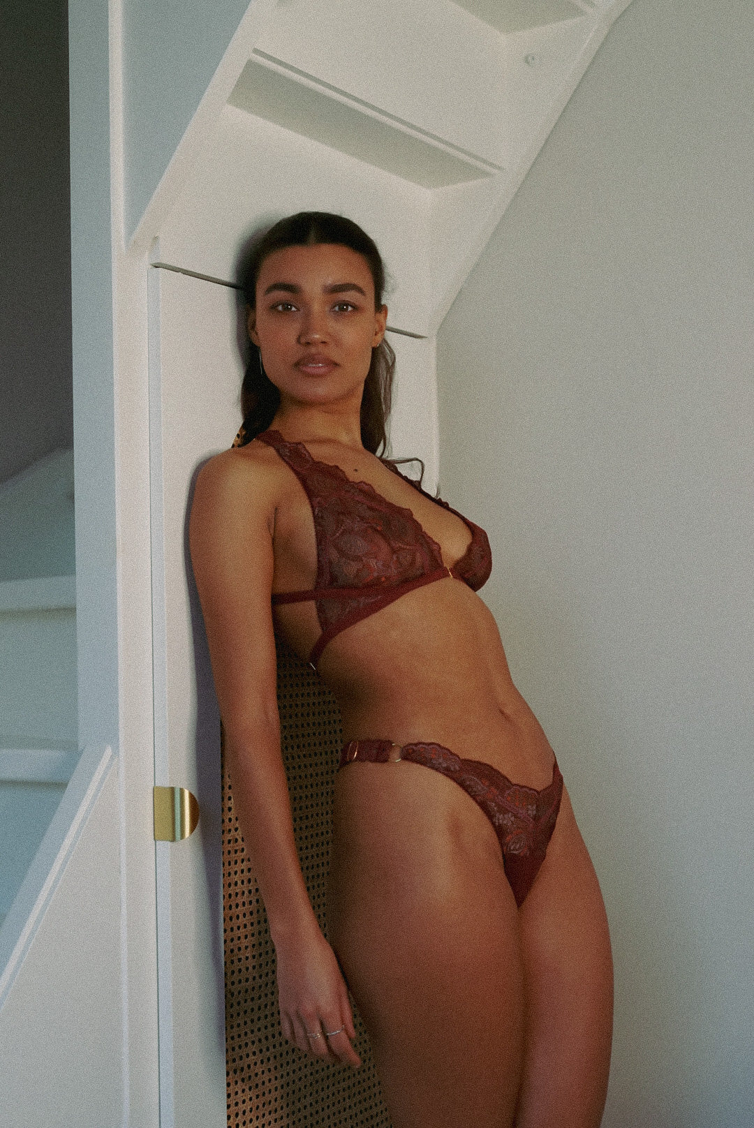 Combineer de Bralette Kiki – Rosewood met een bijpassende slip en jarretel in Rosewood of een complementaire neutrale tint voor een complete, elegante lingerie set. Draag hem onder een blouse met V-hals of een blazer zodat het kant subtiel zichtbaar is, of kies voor een open-top combinatie waarbij de bralette als stijlvol accent fungeert.
